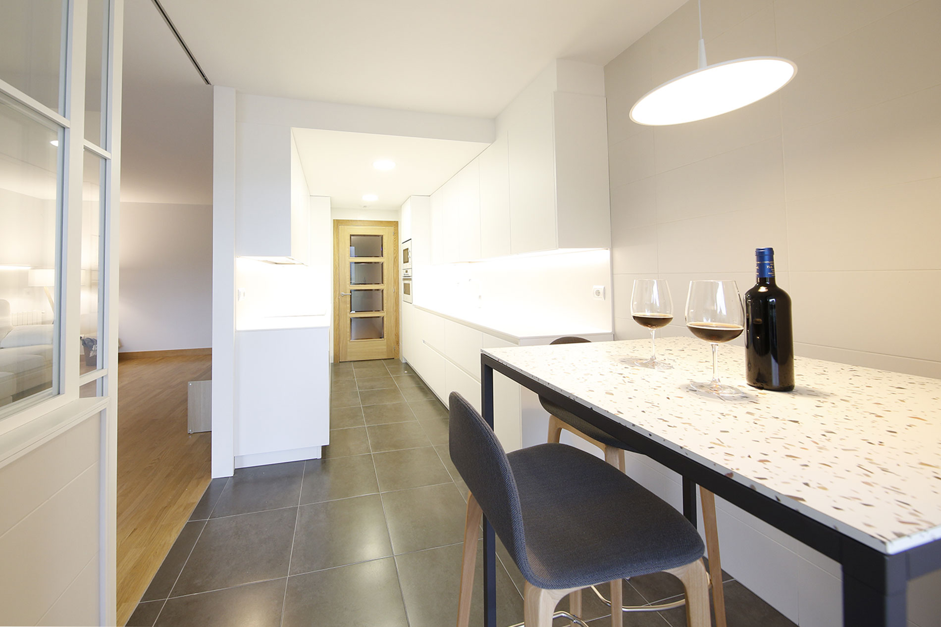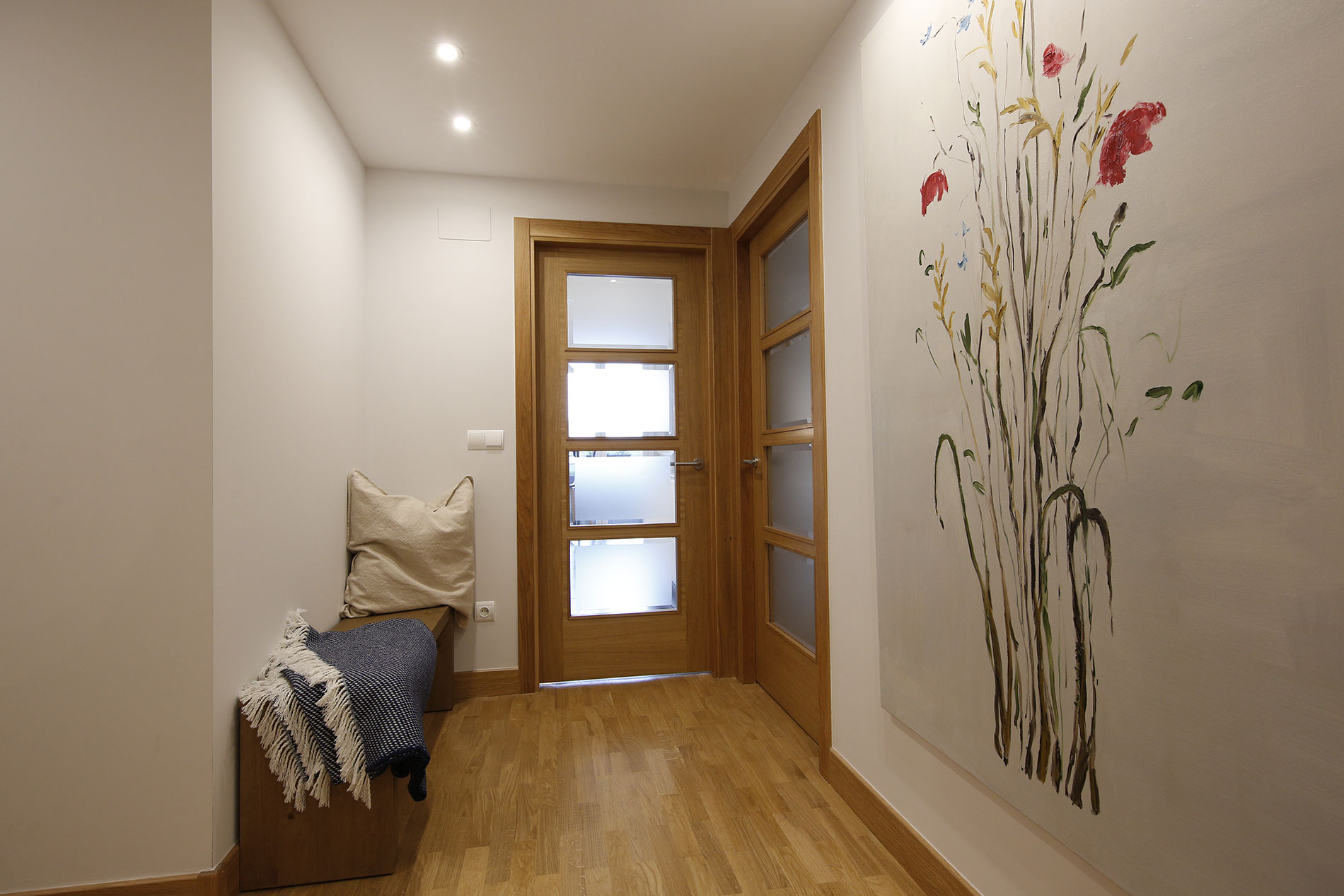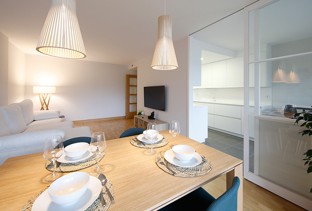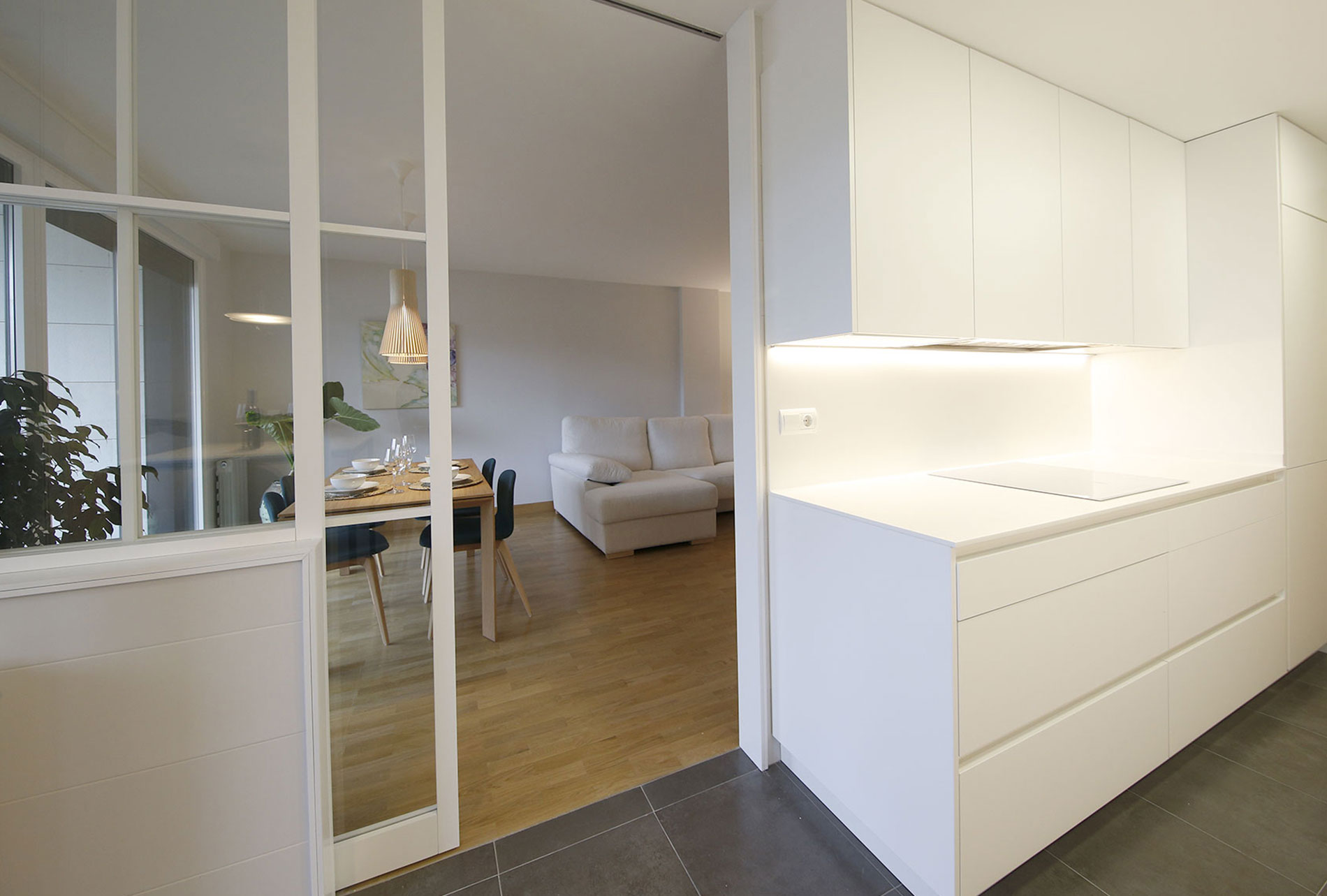 El comedor y el salón son de concepto abierto, ocupando el mismo espacio. La cocina y el comedor están separados mediante una puerta corredera acristalada que ayuda a dar esa sensación de amplitud que buscaba el cliente. También se han decorado el baño principal y el recibidor o entrada del piso.