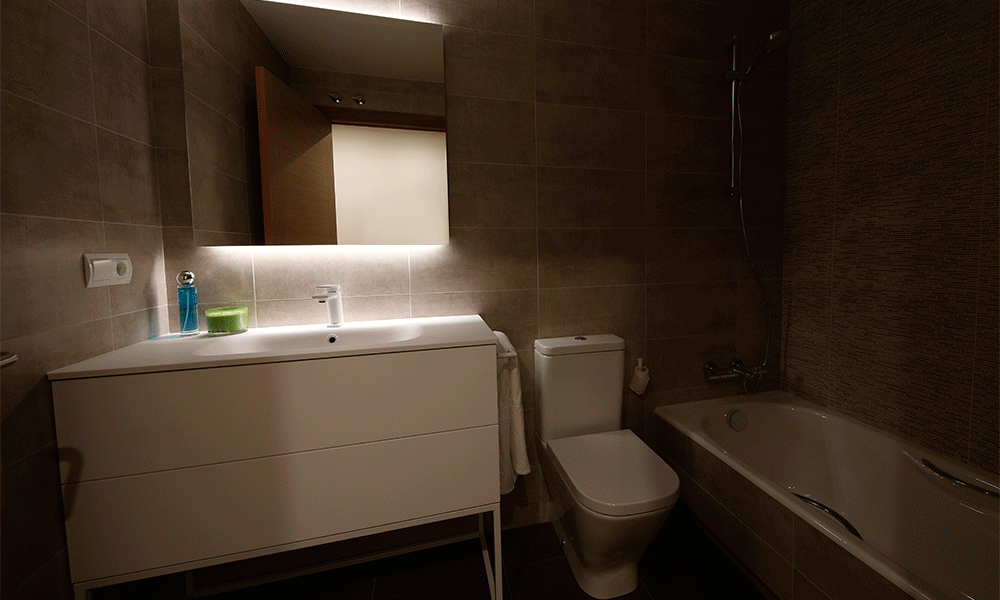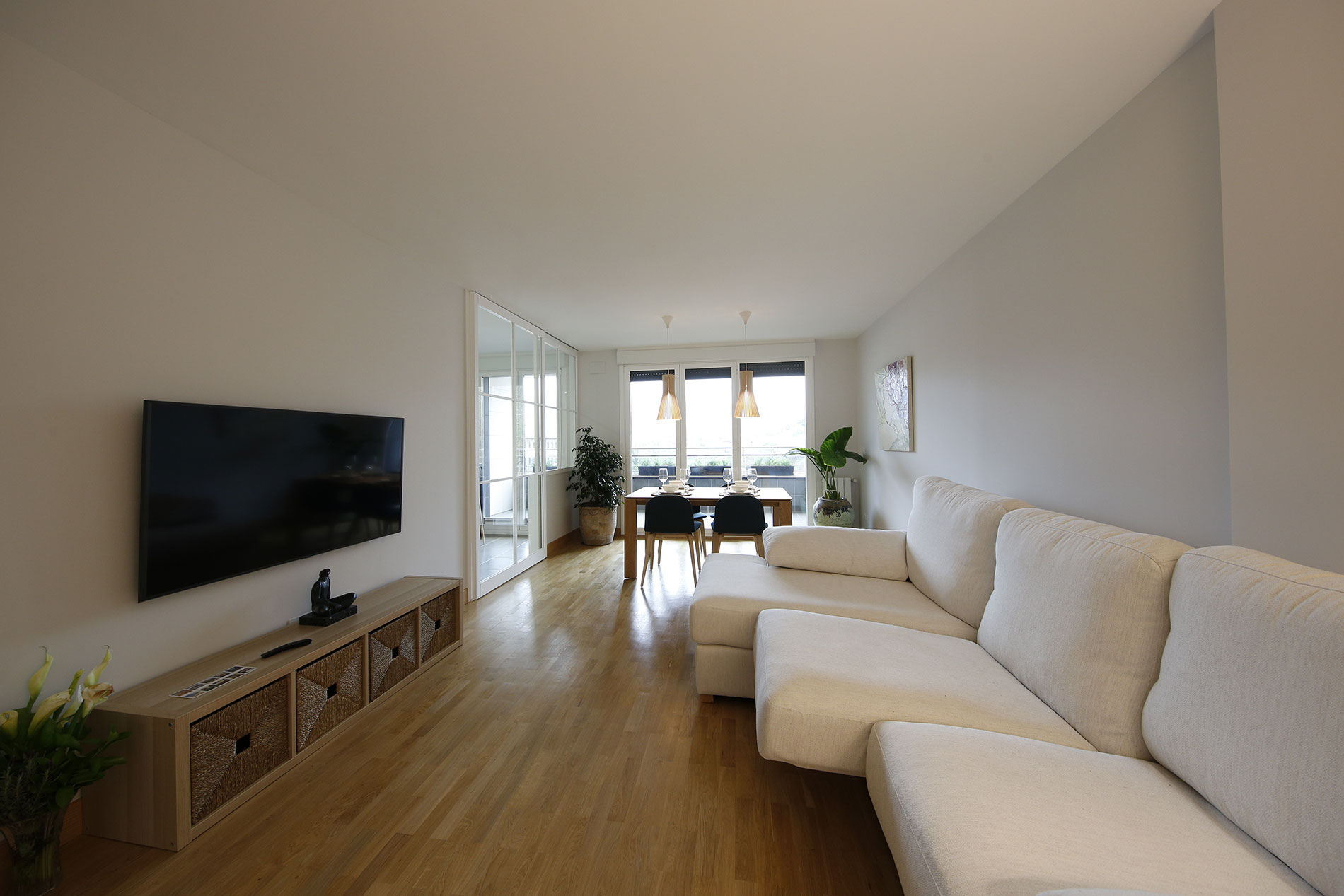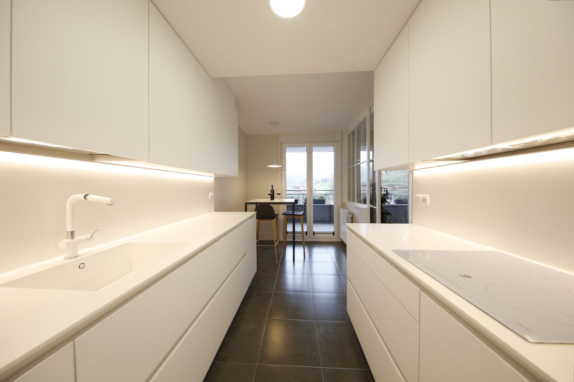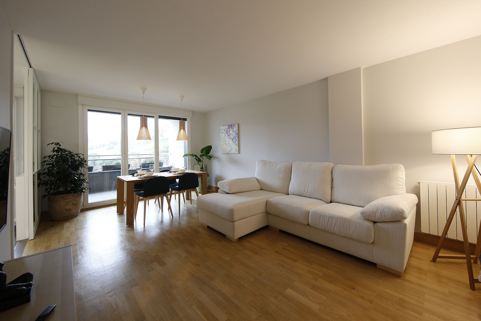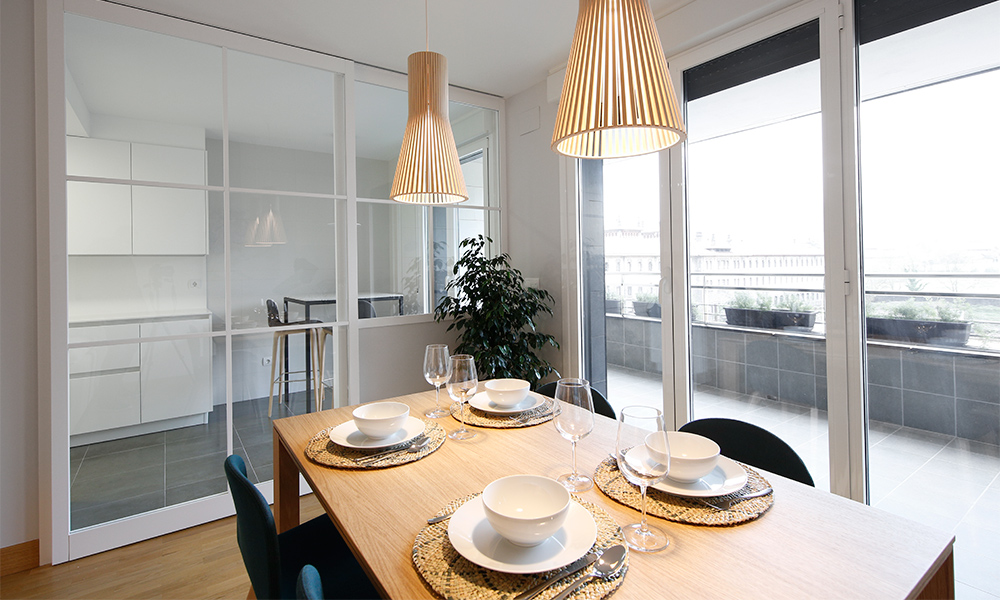 El comedor y el salón son de concepto abierto, ocupando el mismo espacio. La cocina y el comedor están separados mediante una puerta corredera acristalada que ayuda a dar esa sensación de amplitud que buscaba el cliente. También se han decorado el baño principal y el recibidor o entrada del piso.