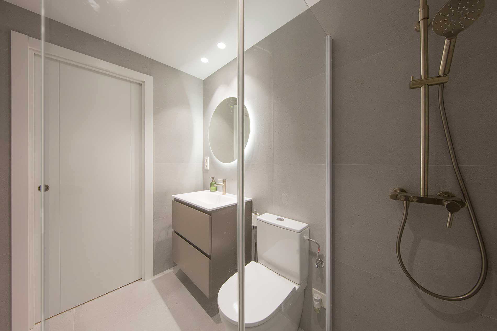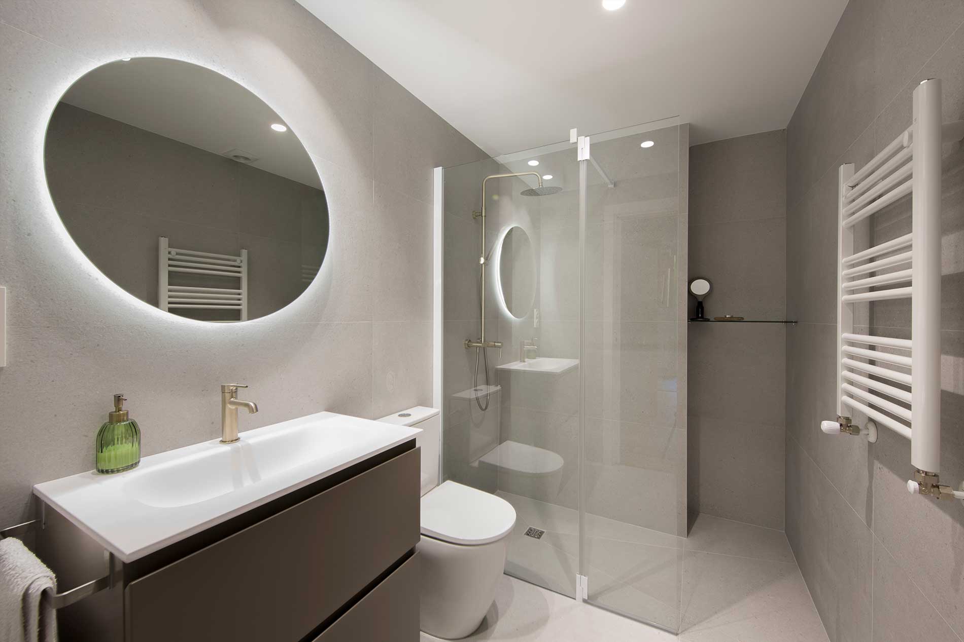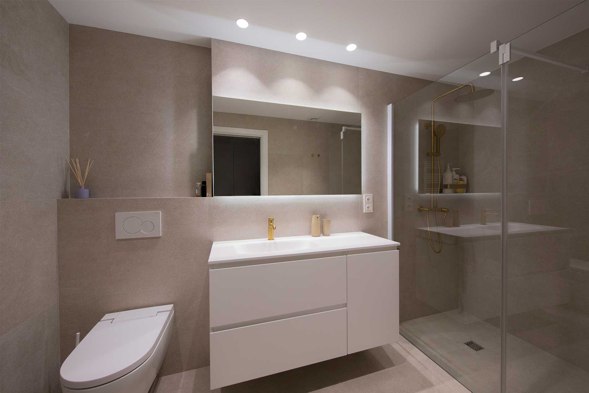 Los baños mantienen un estilo moderno y elegante, con muebles suspendidos, grifería dorada, espejos con iluminación LED y duchas con mamparas de cristal.