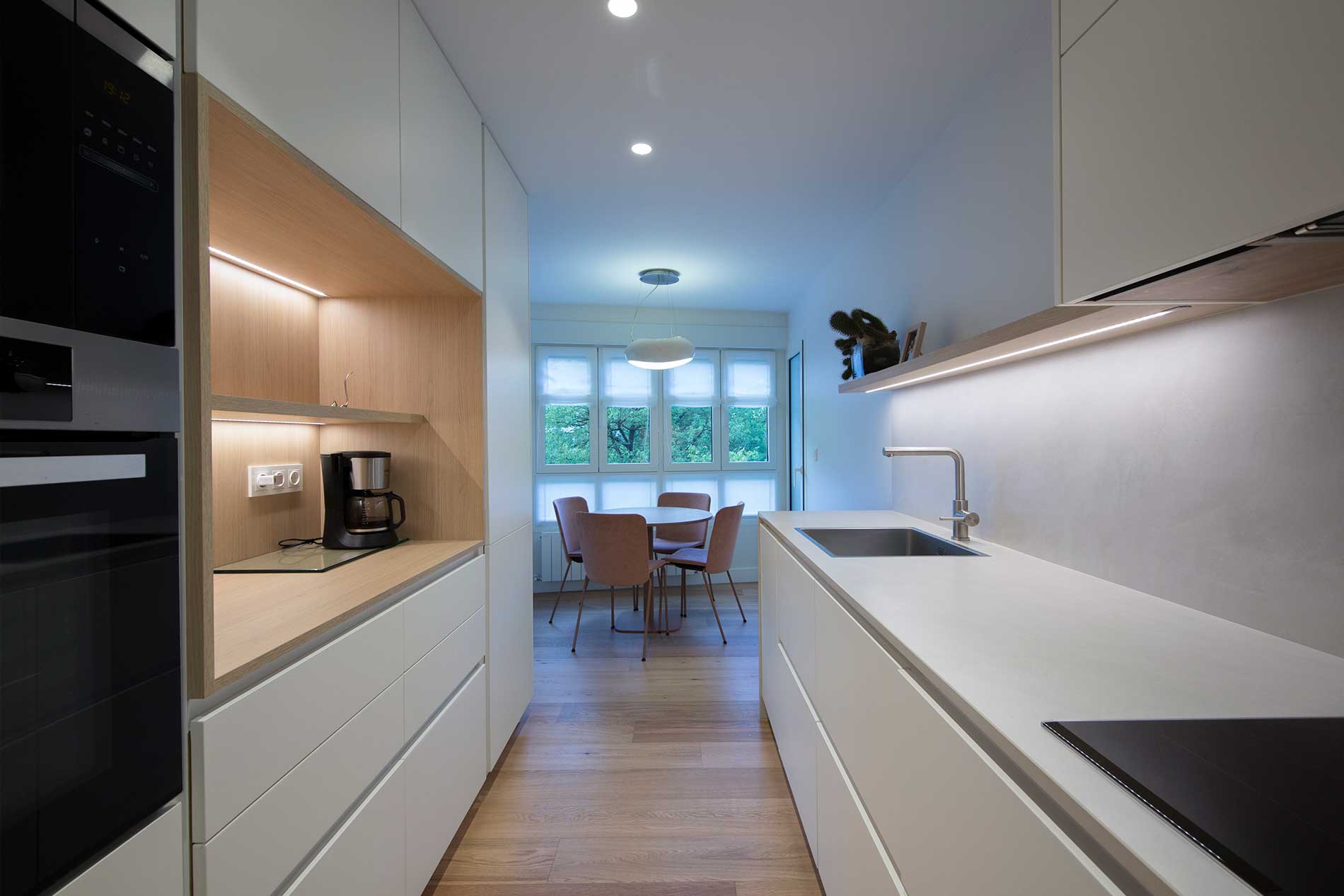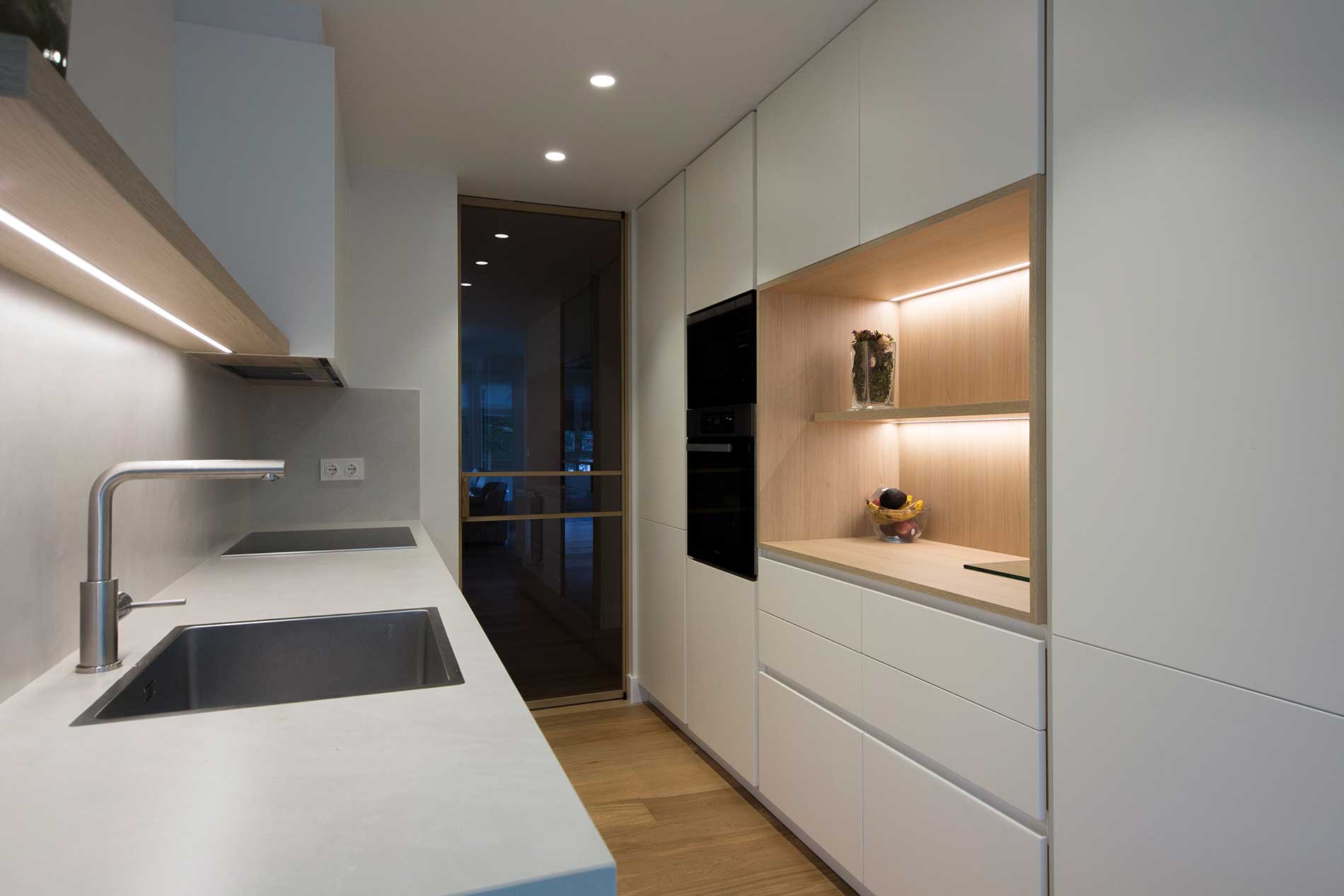 En la cocina se ha utilizado iluminación LED integrada bajo los estantes y en la zona de la encimera, lo que realza el diseño y proporciona luz de trabajo.