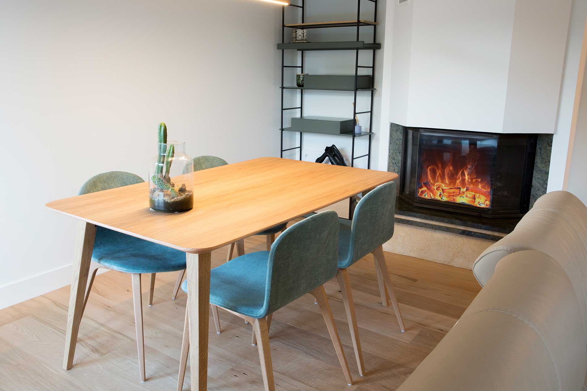 El diseño se caracteriza por líneas limpias, mobiliario en blanco y acabados en madera, lo que le da un aspecto minimalista y funcional.
